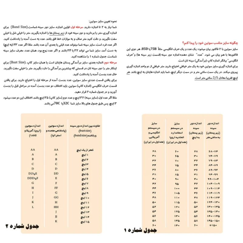 | راهنمای نگهدار و شستشو سوتین | به لیبل لباس زیر توجه کنید، لباس های زیر رنگی را با هم نشویید، لباس زیر را با دست بشویید، در خشک کردن آن دقت نمایید. |